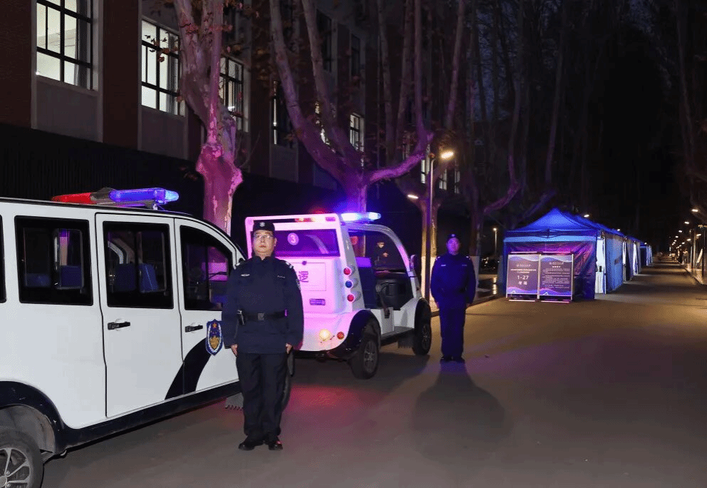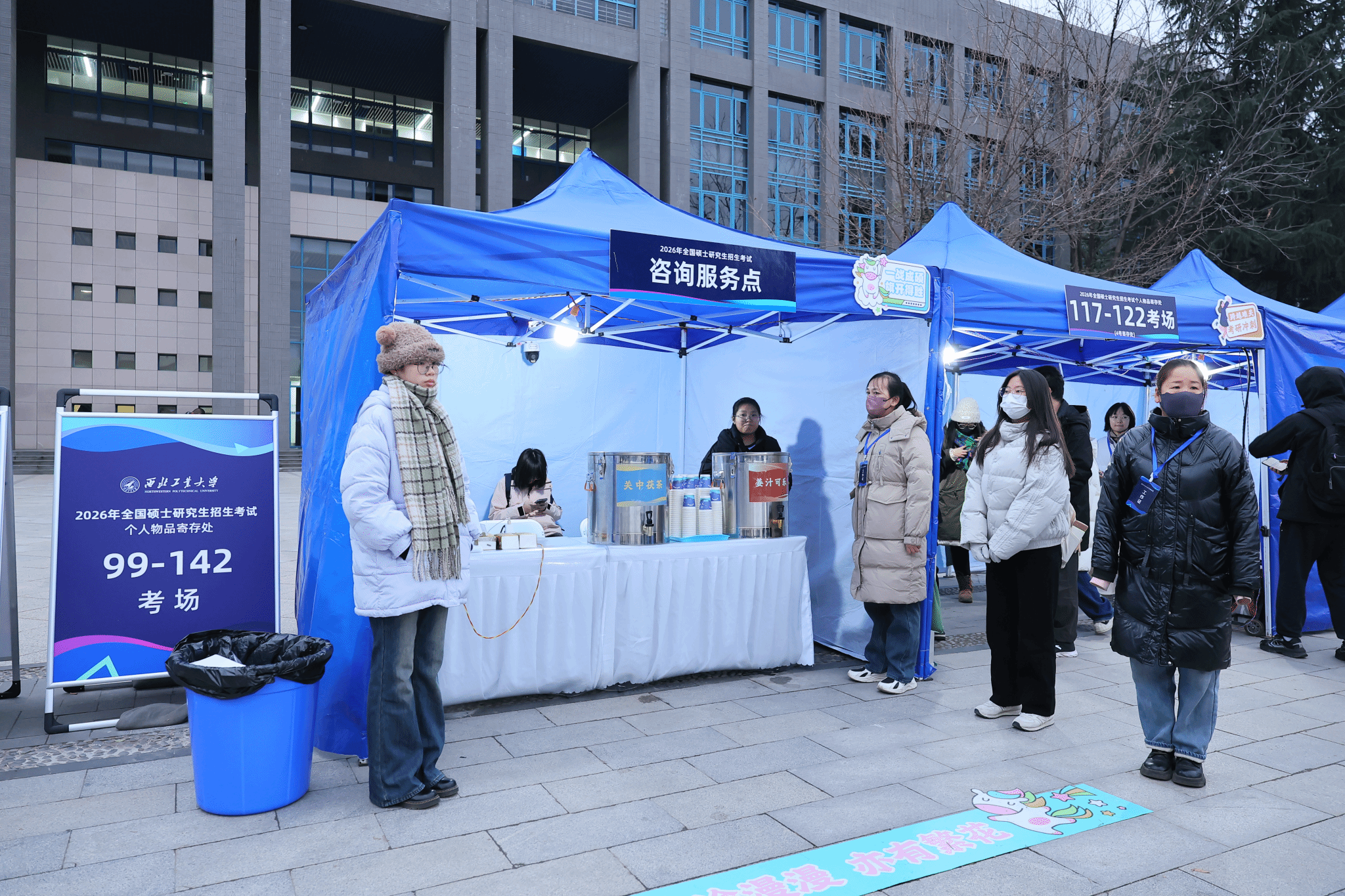 服务保障细致入微,在考场周边设立暖心服务站,持续供应姜汁可乐、茯茶等御寒饮品;新老校区食堂均开设“研考学生特供窗口”,延长午餐供应时间,全力做好餐饮保障。党委保卫部统筹调配60余名安保骨干,加强考点周边巡逻与秩序维护,切实保障考试期间校园安全稳定。