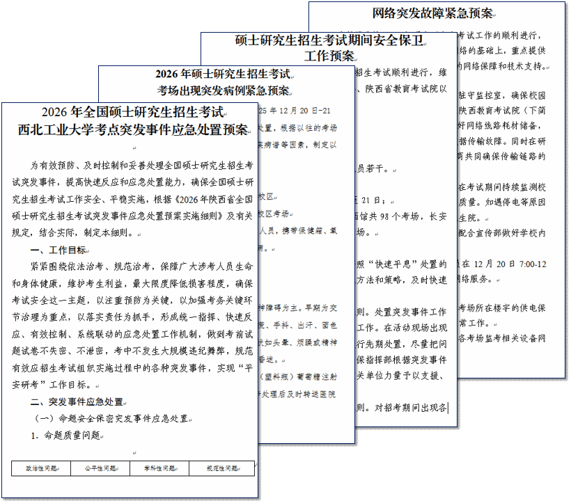 学校成立了由校领导担任组长的研究生招生考试工作领导小组,由研究生院牵头先后组织召开自命题工作部署会、研考协调推进会及考前巡查现场会等系列会议5次,联动党政办公室、党委宣传部、纪检监察机构、党委学生工作部、教务部、党委保卫部、后勤部、保密处、信息化管理处、校医院等11个部门,构建起高效协同、责任明晰的“大考务”工作机制,统筹做好考试组织、安全保障、宣传引导、医疗卫生及应急响应等全方位服务。