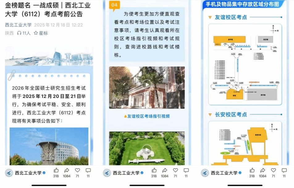 学校始终秉持“考生为本”的服务理念,不断优化考生服务体验,营造温馨、便利的应考环境。考前,通过学校官网、研究生招生网及官方微信公众号等多平台,持续发布考点公告、考场规则、交通指南、餐饮安排等实用信息,主动提供合理考试便利。同步推出《自命题科目条形码粘贴指南》《考场路线导引》《安检流程示意》等系列短视频,以直观形式帮助考生提前熟悉考务要求。校园各个主要入口及通道均设置醒目的考场指引标识,并于考前一天开放考点供考生实地查看。为便于考生识别并加强考场管理,所有安检及考务人员均配备了统一样式的亮色标识马甲,多措并举构建良好迎考氛围。